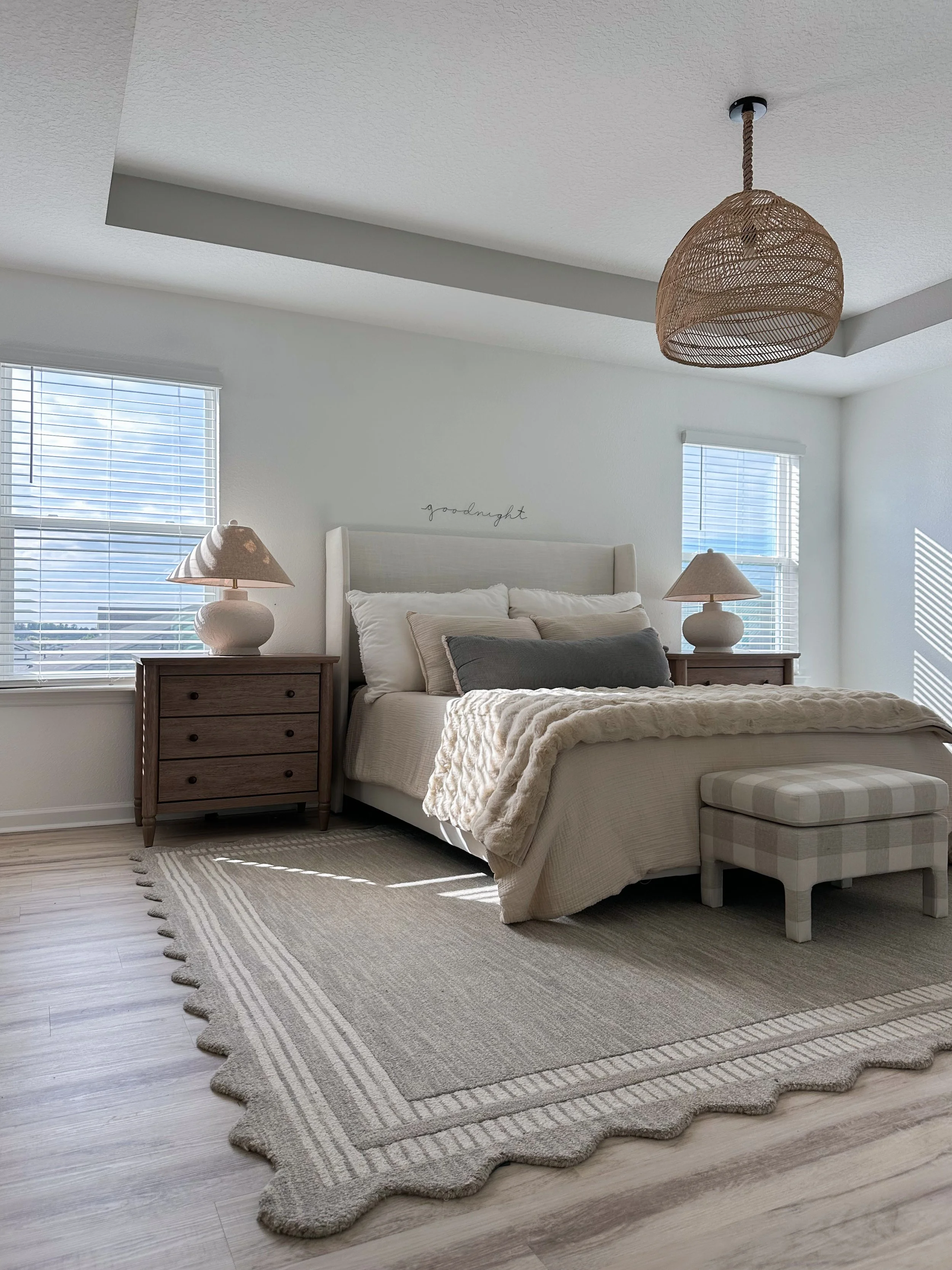 Our bed has been one of my favorite pieces in this space the fabric bed frame in the color “Zuma White” is timeless and adds such an elevated touch. It’s clean and neutral, but still feels soft and inviting. To finish the look, I styled a pair of designer look-for-less nightstands that bring balance and function without taking away from the calm aesthetic.